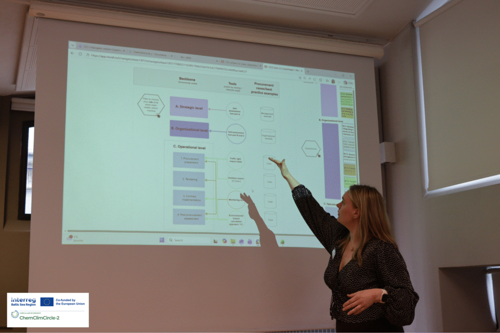 Dar vienas susitikimo akcentas buvo pirmasis CCC „Navigator“ pristatymas – vienas iš pagrindinių. šiuo metu kuriamų projekto rezultatų „Navigator“ kuriamas kaip praktinis, žingsnis po žingsnio veikiantis metodinis įrankis, padėsiantis savivaldybėms integruoti klimato, žiediškumo ir cheminių medžiagų aspektus į viešuosius pirkimus.