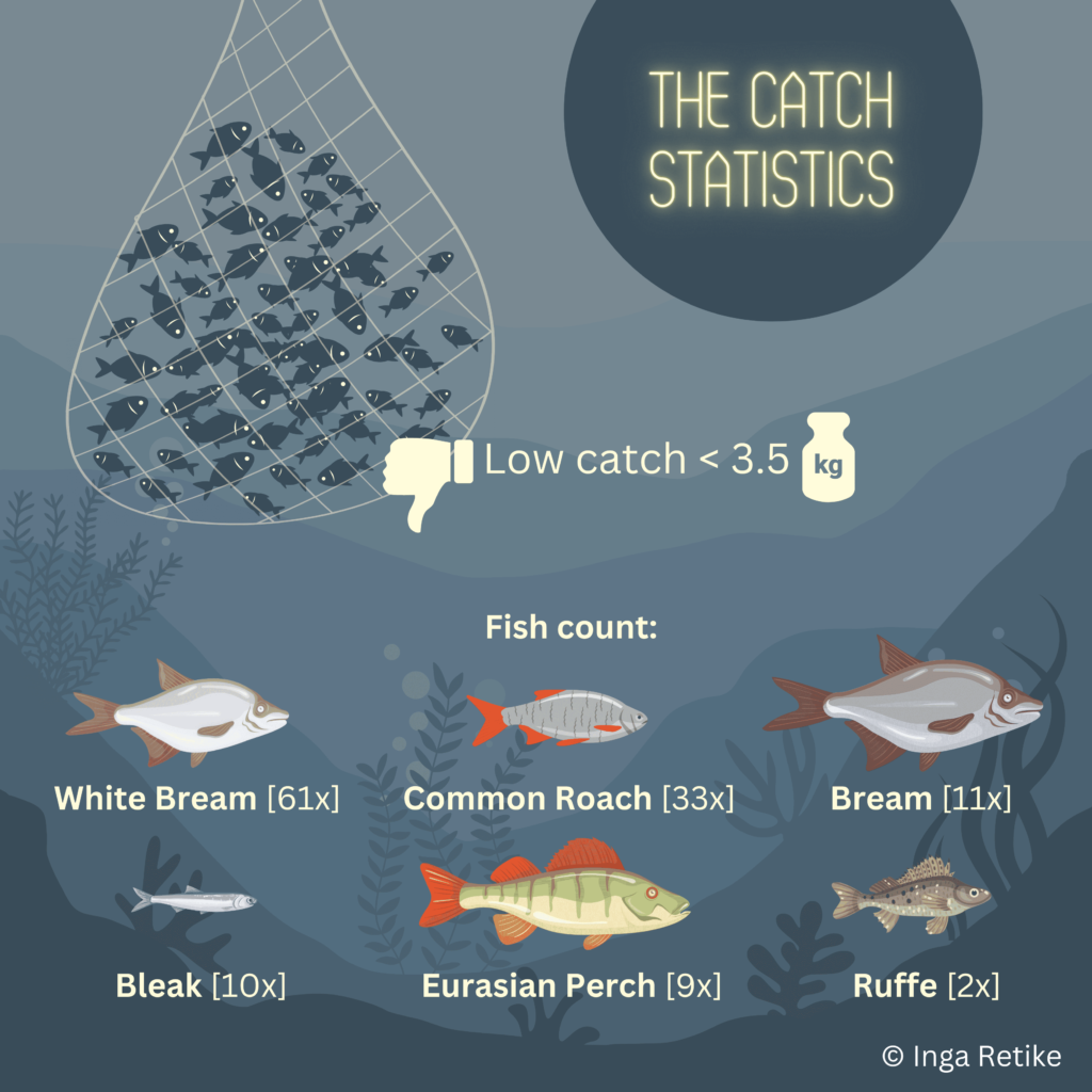 - Sugautas laimikis vos 3,5 kg. individualių žuvų skaičius labai mažas. („Velnezers“ ežero žuvų bendrija labiau nuskurdusi nei manyta anksčiau)