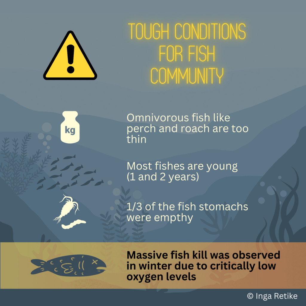 - Gilesniuose ežero sluoksniuose nustatytas mažas deguonies kiekis, kuris paveikė rudens pradžioje pagautas žuvis. Žemas deguonies lygis galėjo priversti žuvis užimti tik paviršinius ežero vandenis, kur šilta vandens temperatūra sukelia stresą žuvų medžiagų apykaitos sistemai ir lemia, kad žuvys yra liesesnės.